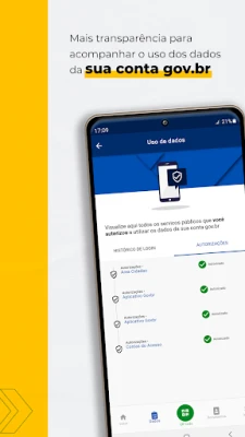 உங்கள் தனிப்பட்ட டிஜிட்டல் ஆவணங்களையும், தரவுகளையும் ஒருங்கிணைந்த இடத்தில் நிர்வகியுங்கள். "gov.br" செயலியின் மூலம் உங்கள் ஆவணங்களைச் சரிபார்ப்பதுடன், தேவைப்படும்போது அவற்றை உங்கள் தொடர்புகளுடன் பாதுகாப்பாகப் பகிரலாம். நீங்கள் உள்நுழைந்த gov.br வலைத்தளங்களின் வரலாற்றையும், உங்கள் தரவு எவ்வாறு பயன்படுத்தப்படுகிறது என்பதையும் வெளிப்படையாக அறிந்துகொள்ளலாம். டிஜிட்டல் வாழ்க்கைச் சான்றிதழ் சமர்ப்பித்தல் மற்றும் மின்னணு ஆவணங்களில் கையொப்பமிடுவதற்கான அறிவிப்புகளைப் பெறுதல் போன்ற ஏற்கனவே பயனுள்ள பல அம்சங்களையும் "gov.br" தொடர்ந்து வழங்குகிறது.