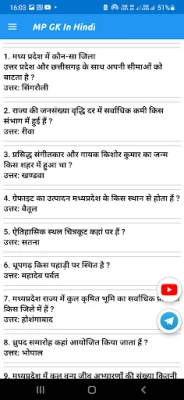 இங்கு, மத்தியப் பிரதேசத்தின் வரலாறு, புவியியல், மாவட்டங்கள், ஆறுகள், ஏரிகள், இசைக்கருவிகள், தொல்பொருள் தளங்கள், நாட்டுப்புற நடனங்கள், முக்கிய லோக் தேவியா மற்றும் திருவிழாக்கள் போன்ற பல்வேறு தலைப்புகளில் 200க்கும் மேற்பட்ட மாதிரித் தேர்வுகளும், 1000க்கும் மேற்பட்ட ஒரு வரி பொது அறிவுத் தொகுப்புகளும் உங்களுக்காகக் காத்திருக்கின்றன. முந்தைய ஆண்டுகளின் தேர்வுத் தாள்கள் உங்கள் பயிற்சியை மேம்படுத்தும். தினசரி இந்தியாவின் நடப்பு நிகழ்வுகள், 20க்கும் மேற்பட்ட பல்தேர்வு வினாக்களுடன் இந்தி மொழியில் வழங்கப்பட்டு, உங்கள் பொது அறிவின் எல்லையை விரிவாக்கும். மொத்தம் 27,000க்கும் அதிகமான பொருள்வகை வினாக்கள் மற்றும் மாவட்ட வாரியான குறிப்புகள் இலவசமாக கிடைக்கின்றன.
